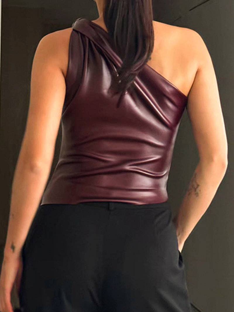 A sleeveless top featuring an asymmetrical neckline, twisted one-shoulder design, and a modern edge.